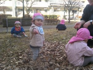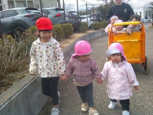 お散歩が大好きなひよこ組。寒さに負けずお天気の良い日は六仙公園など遠出のお散歩もしています。3歳児クラスのお姉さんも付き添ってお散歩出発!